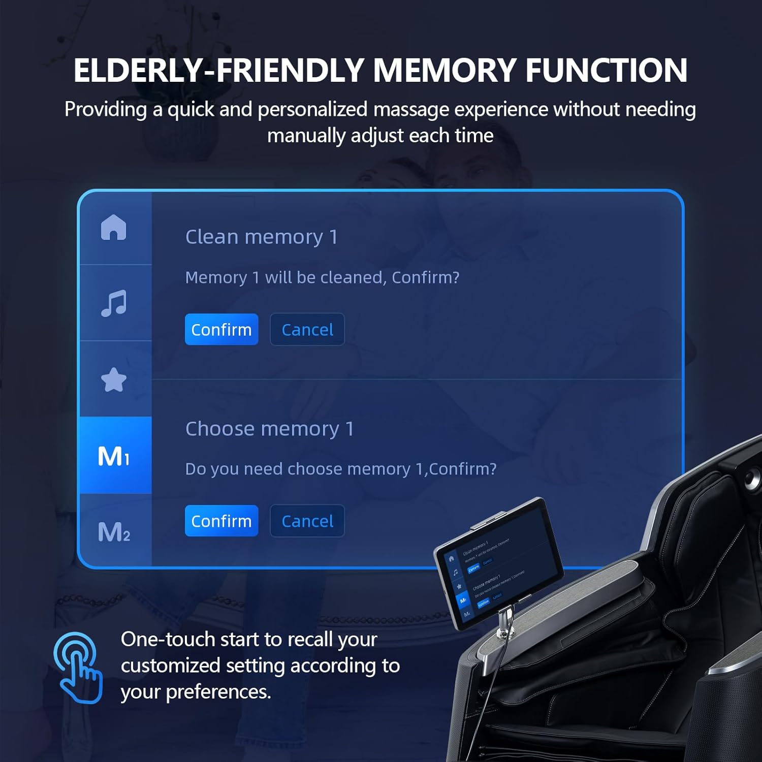 Tecnologia di rilevamento dei segni vitali e’ pensata per dare max sicurezza agli nostri utenti. Il sensore all’avanguardia di tecnologia blocca e interrompe automaticamente il funzionamento della poltrona se vengono rilevate irregolarità. La funzione di memoria consente di avviare il massaggio con un clic, la poltrona richiama le impostazioni personalizzate, offrendo un’esperienza di massaggio sicura e personalizzata senza la necessità di regolazioni manuali.