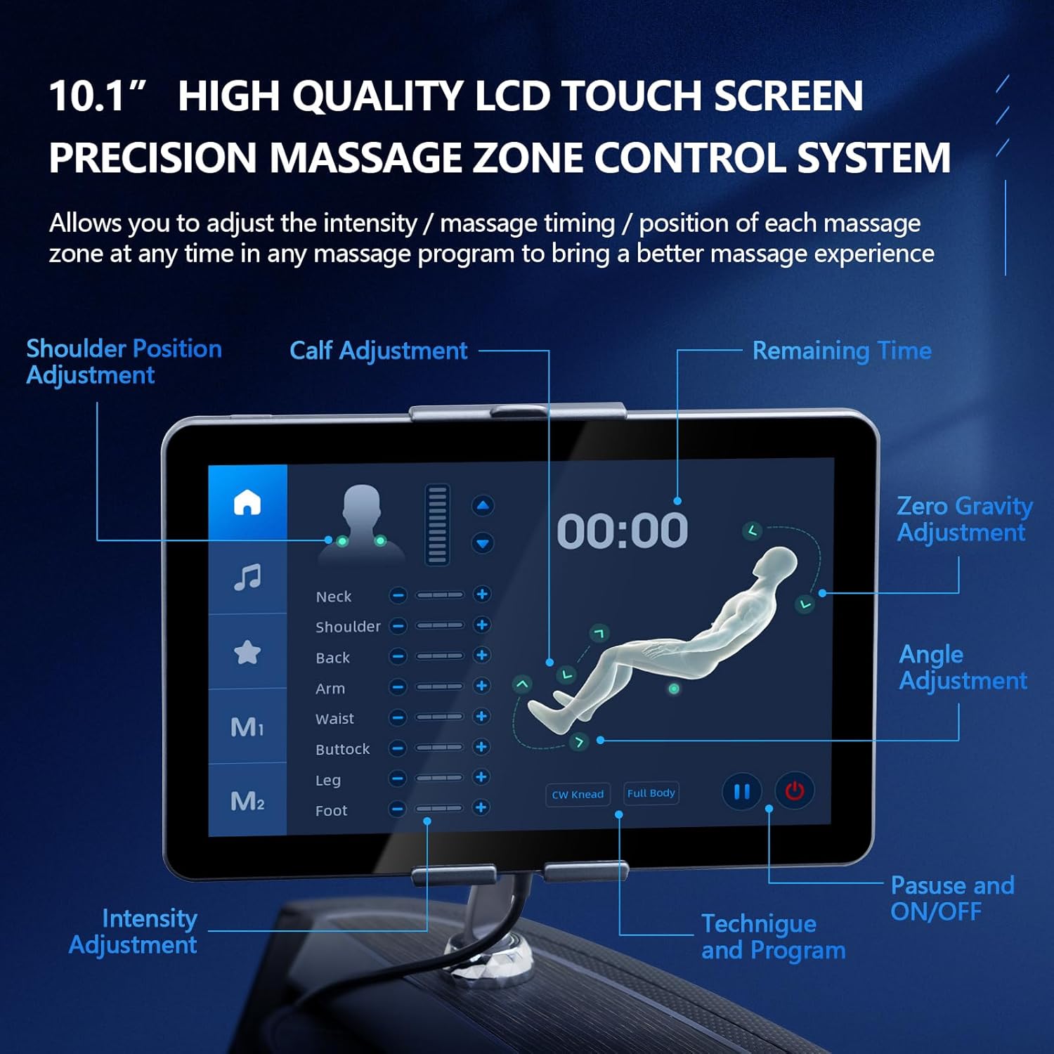 Controllo in tempo reale delle zone di massaggio: dotata di un Touchscreen LCD ad alta definizione da 10,1 pollici,offre un controllo preciso sulle zone di massaggio, consentendo di apportare modifiche e regolazioni di intensita’ in tempo reale durante la sessione. Con un massimo di 48 programmi automatici di massaggi personalizzabili, questo sistema è progettato per soddisfare un’ampia gamma di esigenze dell’utente, garantendo un’esperienza di massaggio eccezionale e personalizzata.